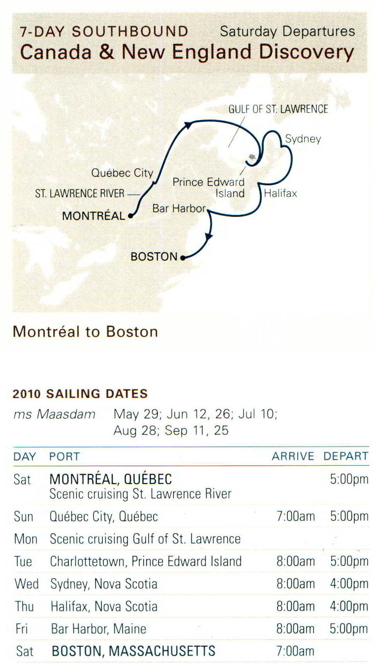 June 26th departing Montreal - St Lawrence river cruise, the New England coast, ending up in Boston July 3rd 2010. – 7 day cruise.